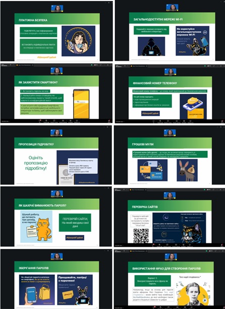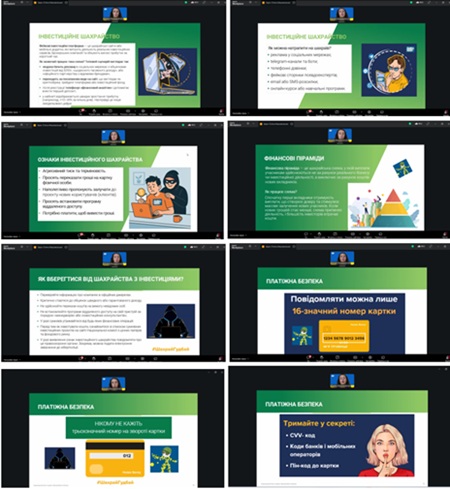 Керівниця напряму інформаційних кампаній Національний банк України Тетяна Машлаковськау ході висвітлення теми «#ШахрайГудбай: актуальні схеми шахрайства та як їм протидіяти» ознайомила учасників із найпоширенішими видами фінансового шахрайства. Було розглянуто сучасні схеми обману, зокрема фішинг, підроблені сайти та шахрайські пропозиції «легкого заробітку» в інтернеті.