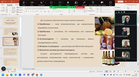 У лютому 2026 року в межах роботи наукового гуртка кафедри харчових технологій ХДАЕУ «Харчовик-науковець» відбулося чергове засідання, присвячене сучасній тематиці: «Інновації у виробництві напоїв (комбуча, функціональні лимонади)». Основною метою заходу стало вивчення новітніх підходів до створення напоїв із підвищеною біологічною цінністю, а також аналіз ролі ферментаційних процесів і природних інгредієнтів у формуванні їхніх властивостей.