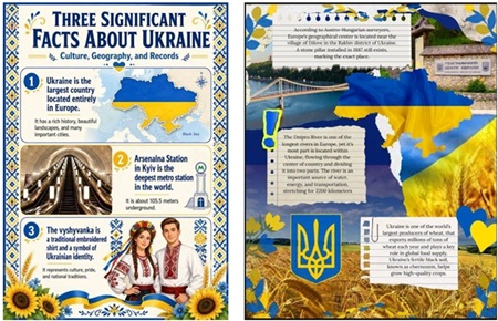 Match. Learn. Share Четвертий день перетворився на справжній виклик для ерудитів. Учасники працювали з інтерактивним завданням Wordwall, де потрібно було співвіднести цікаві факти з відповідними країнами світу. Але все було не так просто: кожен факт містив унікальну деталь, яка вимагала уважності, логіки та широкого кругозору. У другій частині завдання конкурсанти змінили роль – із дослідників на творців. Вони презентували три важливі факти про Україну, оформлюючи їх у вигляді яскравих постерів або презентацій. Візуалізація, креатив і власний погляд на країну стали ключем до успіху. Роботи учасників вразили різноманітністю ідей та щирою любов’ю до України.