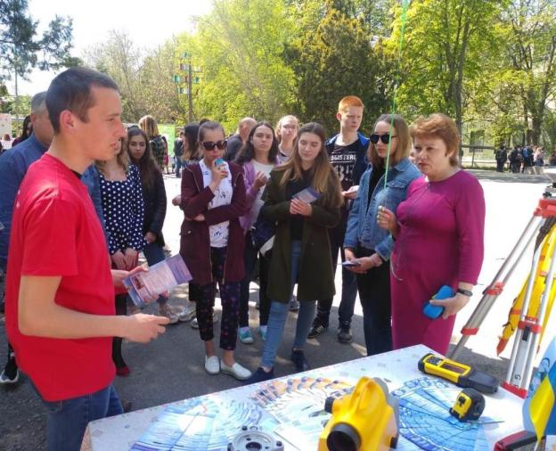 Викладачі кафедри землеустрою, геодезії та кадастру та студенти спеціальності 193 «Геодезія та землеустрій» розповіли майбутнім абітурієнтам про можливості та перспективи навчання на відповідній спеціальності, а також продемонстрували особливості роботи з геодезичними приладами.