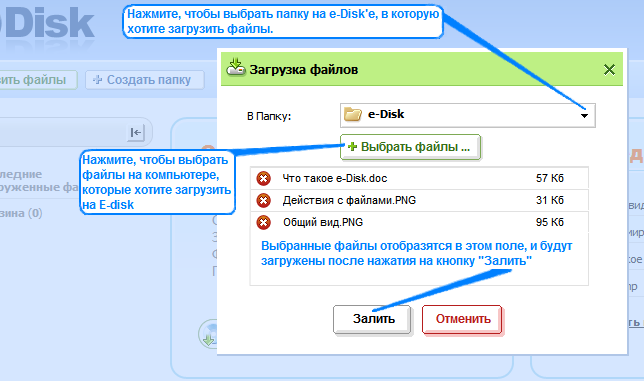 Завантажити файл з комп'ютера на E-disk можна натиснувши посилання "Завантажити файли на E-disk " в центральній частині або "Завантажити файли" у верхній лівій частині екрана. З'явиться службове вікно, в якому можна вибрати куди ( в яку папку) на E-disk необхідно завантажити файл, а потім кнопкою "Вибрати файли" відкрити вміст дисків комп'ютера, і вибрати файл, який потрібно завантажити на E-disk . Після натискання кнопки "Залити" Файл буде завантажений на E-disk .