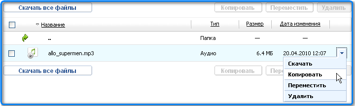 Для файлів, які знаходяться в папках "Відправлені файли" і "Прийняті файли" , доступний пункт меню "Копіювати" . Тобто, якщо Вам хтось пришле великий файл, Ви його можете скопіювати собі в E-disk , на постійне зберігання (не забувайте, що відправлені і прийняті файли зберігаються всього 7 днів).