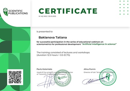 Доценти кафедри рослинництва та агроінженерії Тетяна Бакланова та Олена Сидякіна успішно завершили навчання у форматі серії освітніх вебінарів із наукометрії для підвищення кваліфікації за темою «Artificial Intelligence in Science» («Штучний інтелект у науці»)