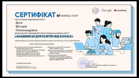 Викладачі кафедри готельно-ресторанного та туристичного бізнесу ХДАЕУ Вікторія Дуга та Ірина Кирилюк успішно пройшли курс підвищення кваліфікації «Академія ШІ для освітян від Google 2.0», організований ТОВ «Академія цифрового розвитку».