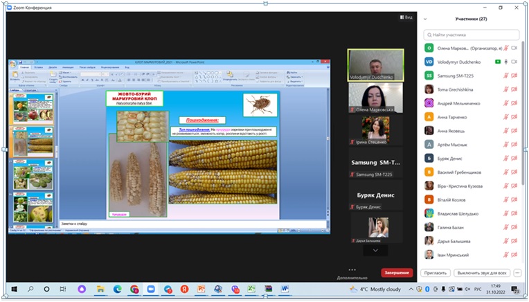 31 жовтня 2022 року на конференц-платформі Zoom відбулось засідання наукового гуртка здобувачів вищої освіти «Захист і карантин рослин» Херсонського державного аграрно-економічного університету, до якого долучилися викладачі кафедри ботаніки та захисту рослин, а також члени наукового гуртка «Фітосанітарний експерт» Одеського державного аграрного університету на чолі з доцентом Балан Г.О.