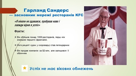 Гарланд Сандерс - засновник мережі KFC, відкрив свій бізнес у 65 і став легендою світової гастрономії.