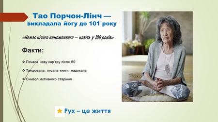 Наукова бібліотека ХДАЕУ пропонує добірку надихаючих прикладів людей, які досягли значних успіхів після 60 років. Вони доводять, що ніколи не пізно реалізувати мрію чи змінити життя: поетеса Ліна Костенко, художник Іван Марчук, фотомодель Леся Салата, засновник мережі ресторанів Гарланд Сандерс, тренерка з йоги Тао Порчон-Лінч.