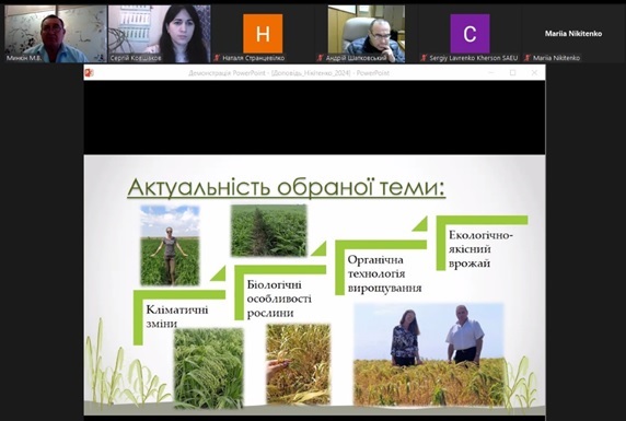 Найголовніше в будь-якій діяльності – це підсумок роботи. 26 січня 2024 року на кафедрі землеробства відбувся попередній захист дисертаційної роботи аспірантки 4 року навчання Марії НІКІТЕНКО за темою: «Розробка адаптивної технології вирощування проса на півдні України» за спеціальністю 201 Агрономія, під науковим керівництвом доктора с-г. наук, професора Аверчева О.В.