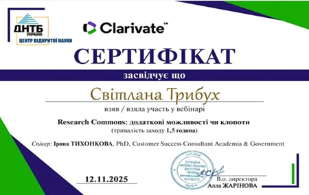 30 жовтня завідувач відділу бібліотеки Херсонського державного аграрно-економічного університету Світлана Трибух взяла участь у вебінарі Clarivate «Представляємо Research Commons – нову базу на платформі Web of Science».