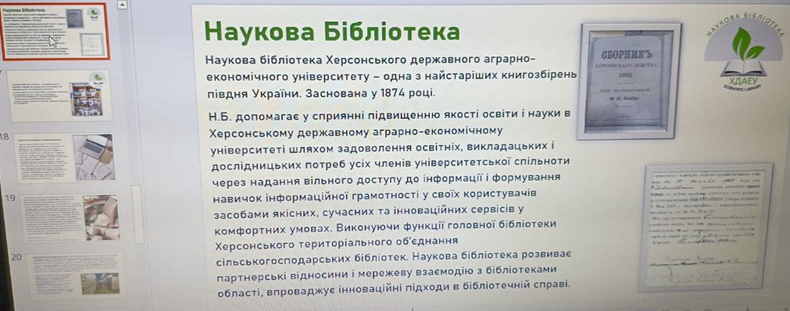 08 жовтня 2024 року Наукова бібліотека ХДАЕУ провела навчальний онлайн-захід на тему «Знайомство з Науковою бібліотекою ХДАЕУ. Формування інформаційної культури здобувачів вищої освіти» для здобувачів вищої освіти першого курсу агрономічного факультету. В.о. директора Наукової бібліотеки ХДАЕУ Світлана Любименко ознайомила здобувачів вищої освіти з історією університету та послугами Наукової бібліотеки ХДАЕУ. Здобувачі вищої освіти отримали детальну інформацію про Наукову бібліотеку ХДАЕУ, організацію роботи структурних підрозділів, сучасні нововведення з урахуванням дистанційного навчання. Семінар був направлений на допомогу здобувачам вищої освіти ефективніше використовувати ресурси Наукової бібліотеки ХДАЕУ y навчальному процесі та науковій роботі. Зустріч пройшла в теплій, дружній атмосфері.